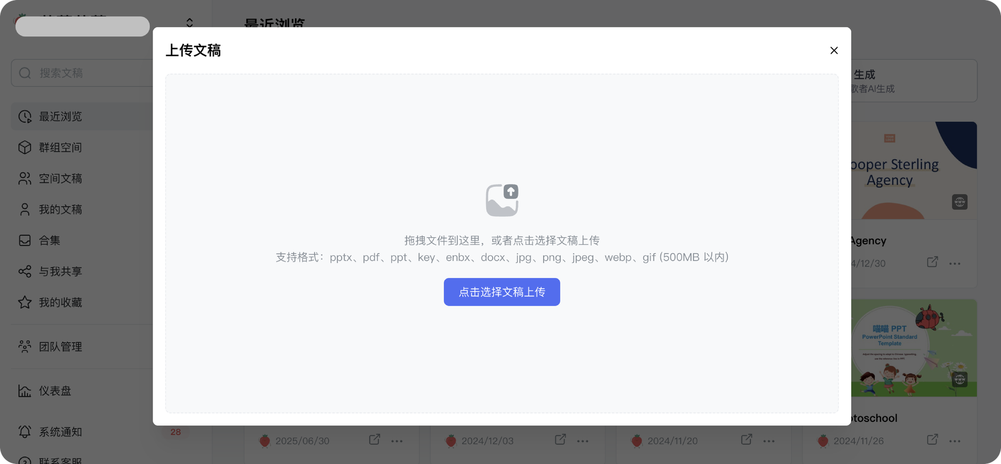 除了 pptx、pdf、keynote、enbx 之外,彩漩现在还支持 docx、jpg、png、jpeg、webp、gif 等多种文件格式。无论是方案文档、图片素材,还是动图演示,都可以直接上传并分享,让内容呈现更加多样化。