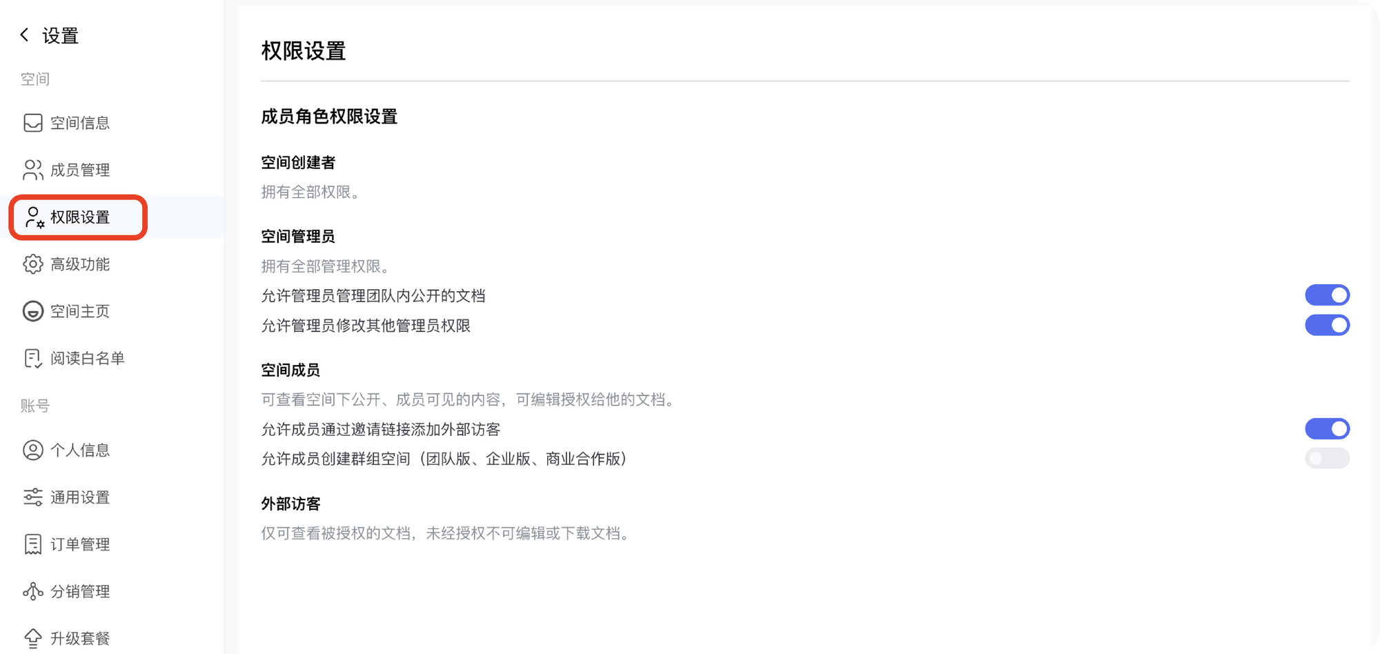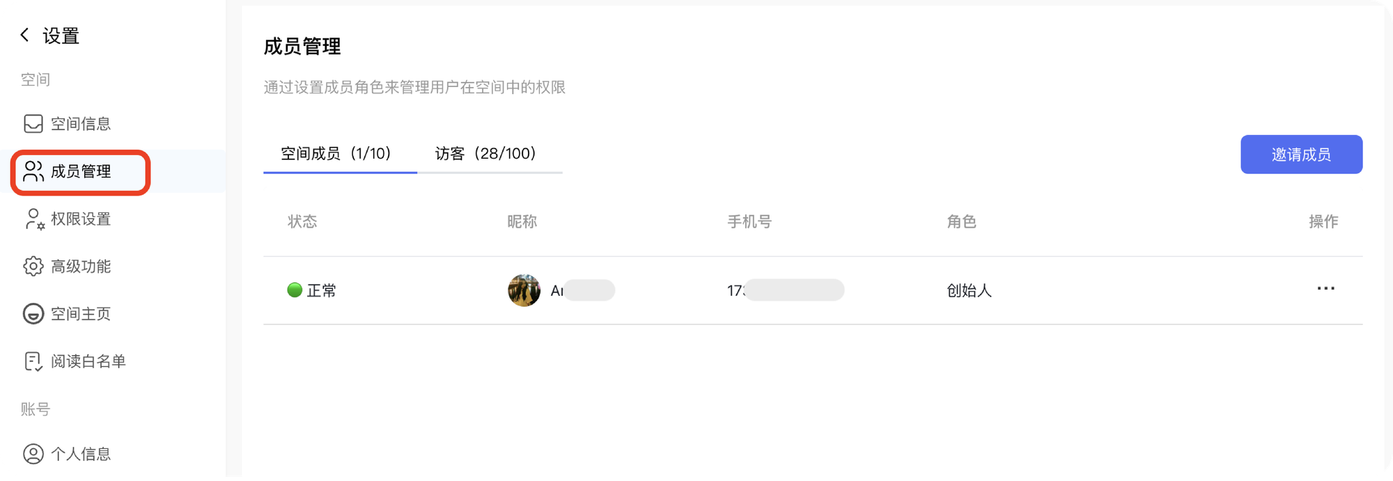 空间创建者和管理员可在「设置」-「成员管理」中添加成员和设置角色,在「权限设置」里灵活配置角色权限,让团队协作更高效,也更安全。